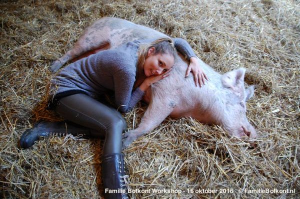 The Promised Land of Pigs (Beloofde Varkensland) is a non-profit organization founded by Dafne Westerhof, an activist militating for the humane treatment of farm animals. For over two decades she has saved hundreds of pigs, either by buying them straight from slaughterhouses, or taking them in from breeders who no longer had use for them or had become too attached to them to have them butchered. Whatever the reason, she’s always been more than happy to accept new pigs into her “Lucky Family” (Familie Bofkont) and give them the life she thinks they deserve.