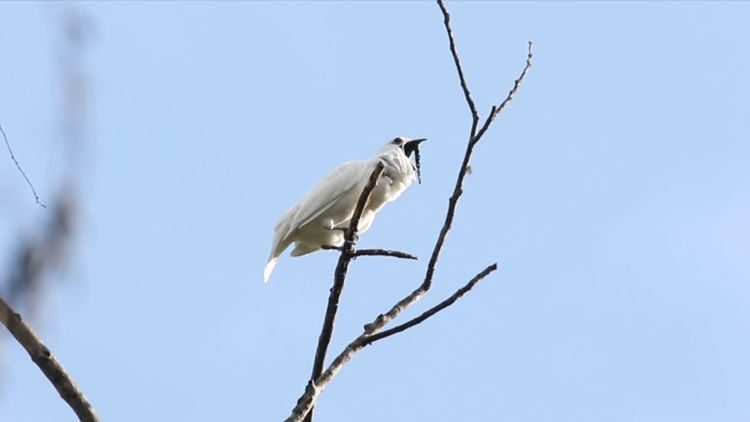 One thing the researchers were able to identify was that the louder the white bellbirds’ mating calls got, the shorter they became, which hints at a trade-of, as the bird’s small respiratory systems only have a bit of airflow to generate sounds.