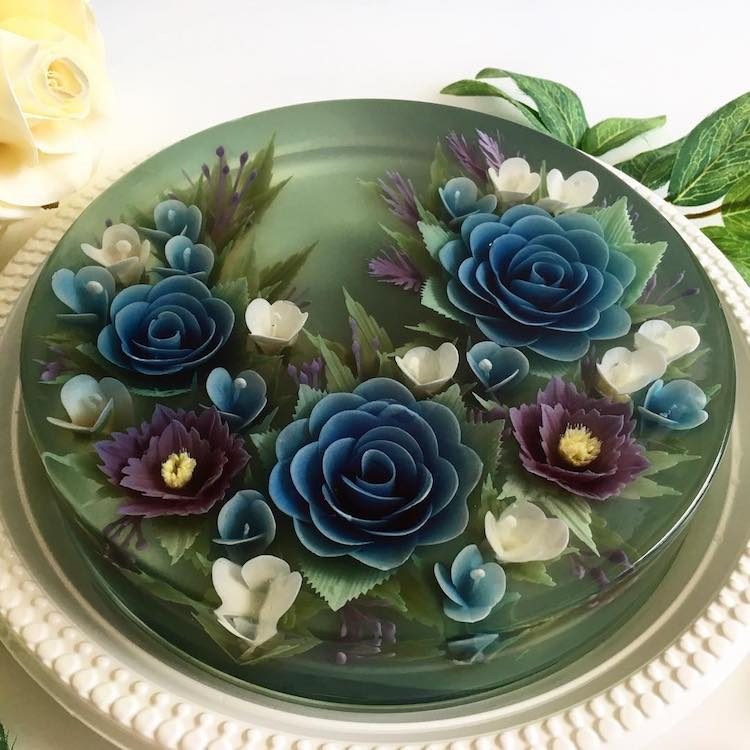 You’re probably thinking that sealing edible flowers in clear jelly doesn’t exactly require mountains of talent, but that’s not how 3D jelly cakes are made. It all starts with a clean canvas – the clear jelly. Once hardened, the artist will use a syringe to inject edible dyes into the jelly, sometimes using various accessories to create different shapes. For example, the slim petals of a dahlia require a steady hand and a standard syringe needle, while larger flowers, like roses, require a spatula like tool to be attached to the syringe, and a completely different technique.