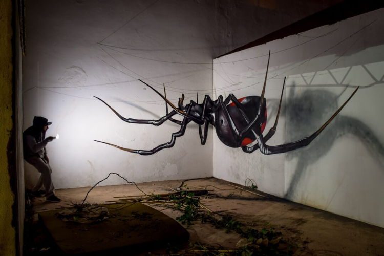 Spay-painting on differently-angled surfaces and corners, Odeith is able to create some truly stunning optical illusions, like giant spiders and other insects that look ready to lash out at prey, or elaborate lettering that appears to float in midair.