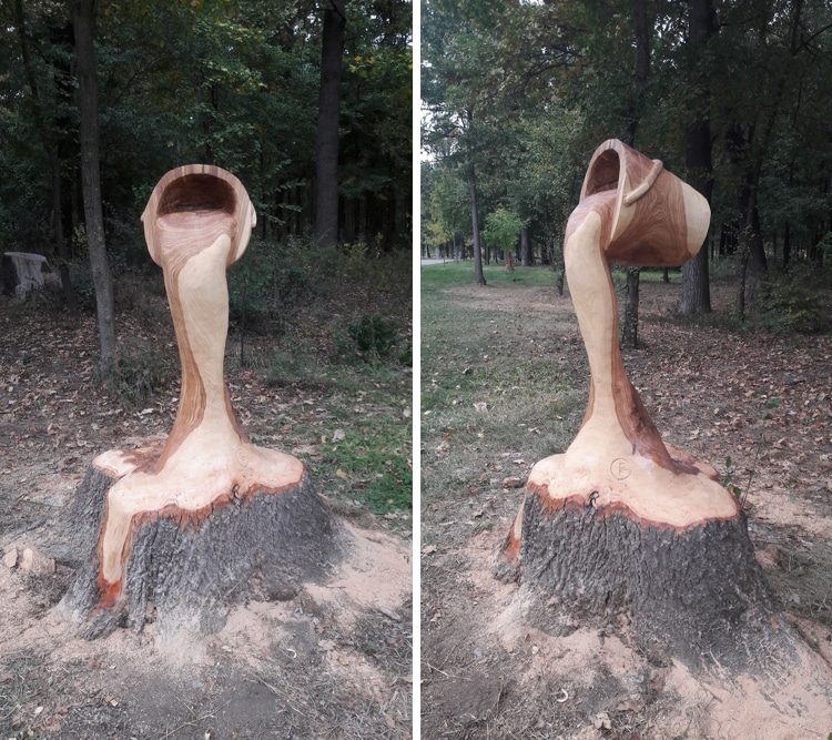 But having to adjust in order to match the material available sometimes leads to even more impressive results. Case in point, Gabi Rizea’s most popular creation, “Galeata Care Curge” (Water Pouring from Bucket”, a masterpiece carved from an old ash tree. After discovering that half the stump was rotten, the Romanian artist knew that the middle part of his design had to be very thin, and it ended up becoming the water flowing from a bucket.