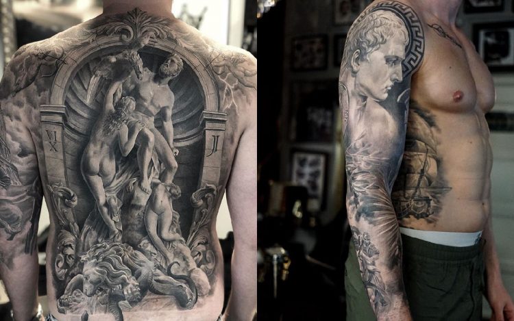 The young Swedish tattooist has an impressive portfolio of black-and-white tattoos, from portraits of pop icons and famous movie scenes to original designs, but it’s his hyperrealistic statuesque tattoos that have been getting a lot of attention on social media platforms like Instagram. And for good reason, as his Greco-Roman art-inspired masterpieces sometimes look chiseled onto their wearers’ bodies.