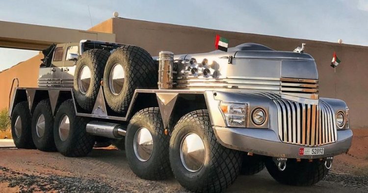 Called Dhabiyan, the monstrous 10-wheel vehicle is based on the Oshkosh M1075 military truck with a Jeep Wrangler annexed to it as a driver cabin. It is powered by a 600hp, 15.2-liter, 6-cylinder Caterpillar C15 diesel engine, weighs a whopping 24 tonnes and measures 10,8m in length, 2.5 meters in width, and 3.2 meters in height. Dhabiyan was reportedly designed and built by Sheikh Hamad bin Hamdan Al Nahyan, one of the most well-known car collectors in the UAE.