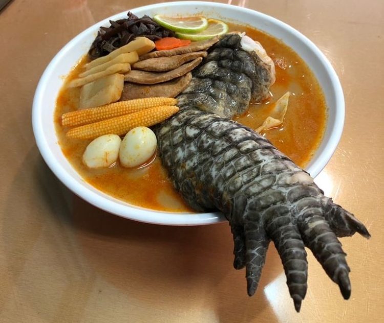 Taiwanese ramen has been getting weirder and weirder in the last few weeks. It all started with the isopod ramen we featured at the end of last month, which featured a giant isopod as the main ingredient. Then it was the ‘Frog Frog Frog Ramen‘ by Yuan Ramen (圓拉麵), which featured a giant unpeeled frog, and recently culminated with another Yunlin area ‘delicacy’, a crocodile ramen aptly named ‘Godzilla Ramen’. The dish is reportedly made with 40 different spices, but the main ingredient literally sticking out of the bowl is a braised crocodile leg.