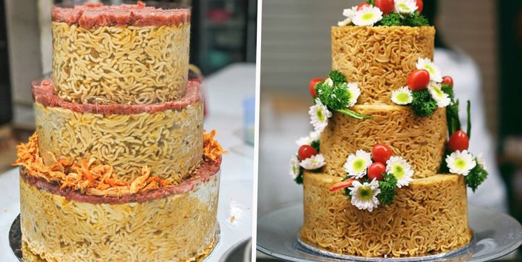 The people at Tot Aw (short for totally awesome) bakery in Jakarta, Indonesia have getting a lot of attention lately and it’s all due to their unusual cakes. Instead of sweet sponge and sweet cream and toppings, they are made of Indomie noodles shaped as tiered cakes and topped with all kinds of foods, like meatballs, chicken or salted cuttlefish. The squiggly creations are apparently quite popular at weddings, birthdays and other events.