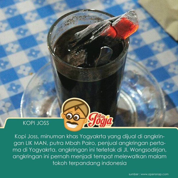 Kopi joss, or charcoal coffee, starts off as regular coffee in Central Java. Ground coffee and four spoons of sugar are poured into a glass, and them boiling water is added. Then, Mr.s Alex picks up a lump of red hot coal with his tongs and sumps into the glass as well. That causes the coffee to bubble over and sometimes spill over the glass, so if you’re putt off by coffee grounds all over your glass, this drink may not be for you. Once the coal cools, you can take it out of the coffee and enjoy the drink.
