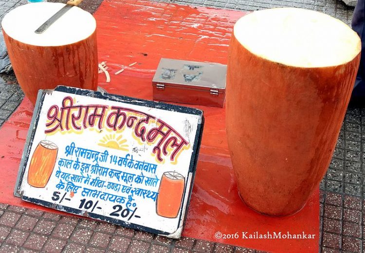 Ram kand mool is often advertised as the only food source of Lord Ram when he was exiled to forests along with his wife Sita and brother Lakshman, and vendors claim it can cool you down during the summer, quench both hunger and thirst, and provide all sorts of medicinal relief. It is served with all sorts of seasonings, from chili and salt, to lime and sugar. It’s cut and served as very thin slices out of tubers that can reportedly weigh up to 300 kilograms.
