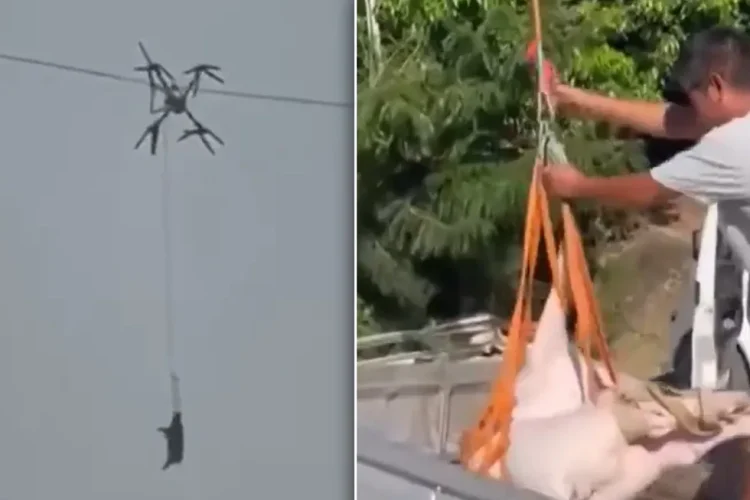 While attempting its maiden voyage to the slaughterhouse, the drone became entangled in high-voltage powerlines, which not only caused the poor pig hanging from it to remain suspended in the air for hours, but also cut the power to the entire village of
