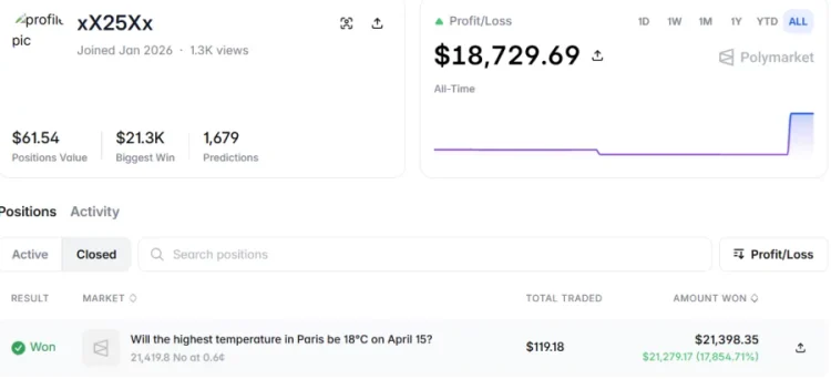 It was soon revealed that the temperature anomalies coincided with unusually high winnings on Polymaket linked to bets on Paris temperature readings at the exact time of the abnormal readings. For example, an anonymous trader with the username “xX25Xx” bet $119 that the weather in Paris on April 15 would jump past the equivalent of 64 degrees Fahrenheit and won $21,398.