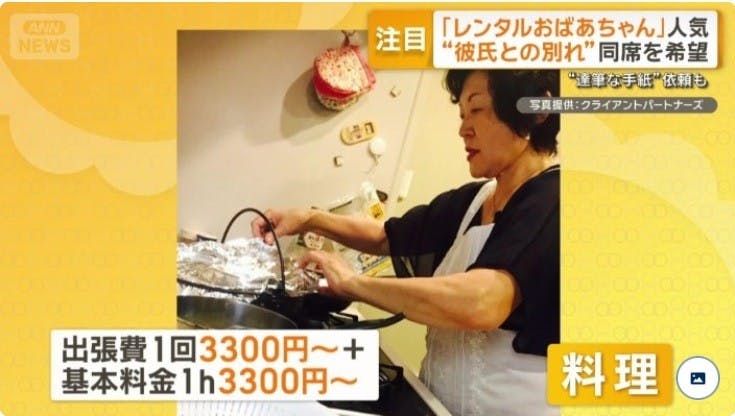 To rent a grandmother, clients have to pay the 3,300 yen ($23) base fee, plus any transportation fees, and are responsible for the granny’s necessary expenses during the time they spend together.