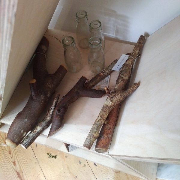 Made from birch or holly, the sticks are planed and sanded at the back and have holes drilled in them for easy mounting on the wall. Some of them have small notches that can be used to hang coats on.