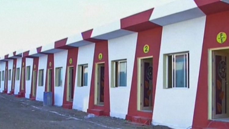 The 90 houses measure 12 by 20 square feet, feature two windows, two doors and have all been painted red and white. They’re basic dwellings by Western standards, but for their new owners, they are more than they had ever hoped for.