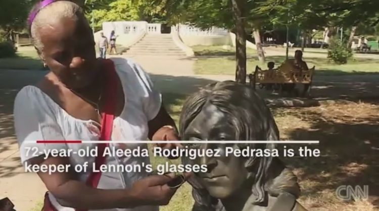 About two years ago, after seeing that Lennon’s glasses constantly went missing, she started placing her own glasses on the statue. One day, they were stolen as well, and then another pair. But the authorities noticed her dedication and hired her as the official guardian of the glasses. Today, Pedrasa receives 245 Cuban pesos a month – more than what most Cubans make – to look after the glasses and make sure that they are on the bridge of bronze Lennon’s nose when tourists arrive at Havana’s John Lennon Park to take photos with him.