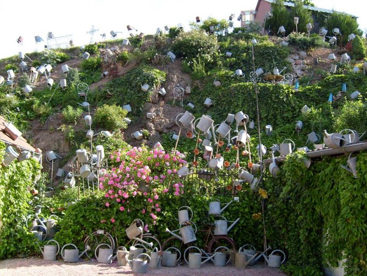 Soon the walls and roof of Bruno’s flower shop were covered with water cans, not to mention the ones placed on display inside, but he wasn’t going to let lack of space stop him from expanding his collection. The small hill next to his garden provided all the extra display space he needed, and today it is also decorated with hundreds of dangling water cans. Who knows what his next target will be when he runs out of space again.